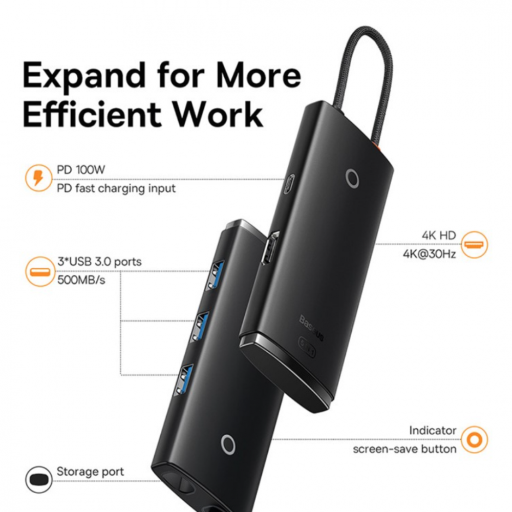 Baseus Lite Series 5-Port Type-C Hubking Station مع HD Video Output + 3xusb 3.0 + PD Charging Port