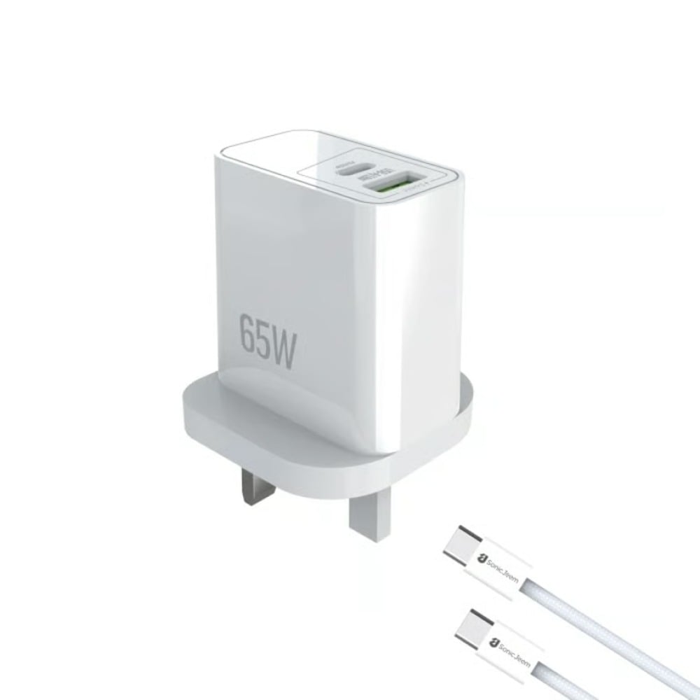 SONIC JEEM - فيش جداري شحن سريع بتقنية GaN بقوة 65 واط (تايب سي و USB) + كيبل تايب سي