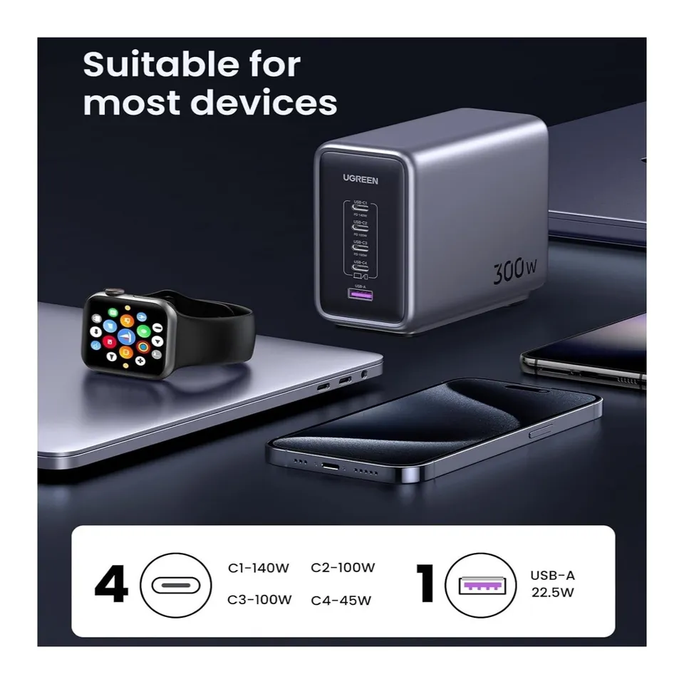 - قدرة إجمالية 300 واط: شحن يصل إلى 3 أجهزة كمبيوتر محمولة في نفس الوقت دون التأثير على سرعة الشحن.
